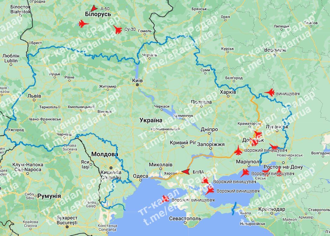 В среду утром, 22 февраля, произведены запуски беспилотников типа "Шахид" из Приморско-Ахтарского Краснодарского края РФ, а С военного аэродрома "Мачулищи" в Беларуси зафиксирован взлет истребителя МиГ-31К.