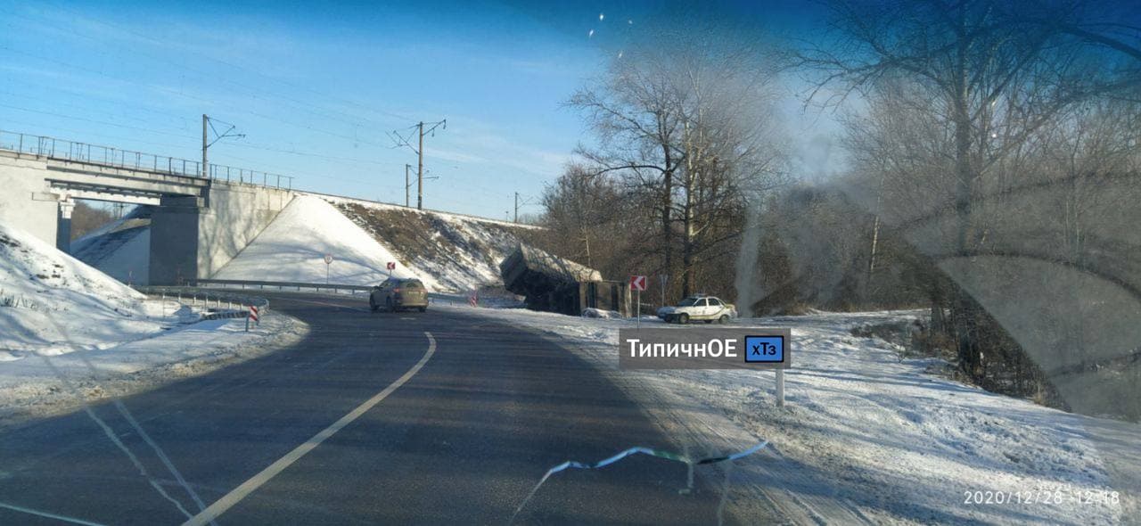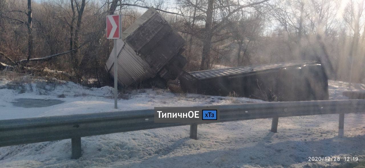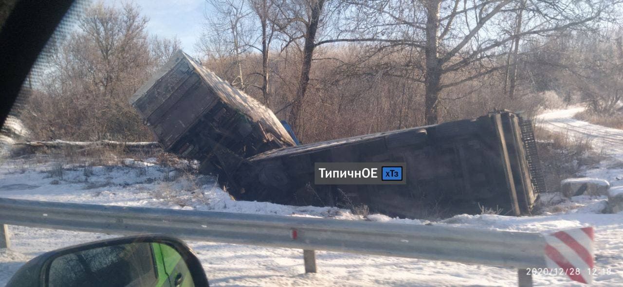 ДТП произошло вблизи села Грушевка, что под Купянском. Водитель грузовика, очевидно, не снизил скорость, заходя в поворотом, поэтому автомобиль занесло и он перевернулся на обочину.