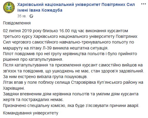 Как отмечается, чрезвычайное происшествие случилось около 16:00 2 июля 2019 года. В момент ЧП в самолете находился курсант третьего курса университета, который выполнял учебно-тренировочный полет.
