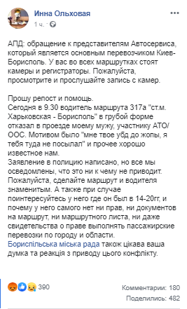"Обращение к представителям Автосервиса, который является основным перевозчиком Киев-Борисполь. У вас во всех маршрутках стоят камеры и регистраторы. Пожалуйста, просмотрите и прослушайте запись с камер", - написала она.