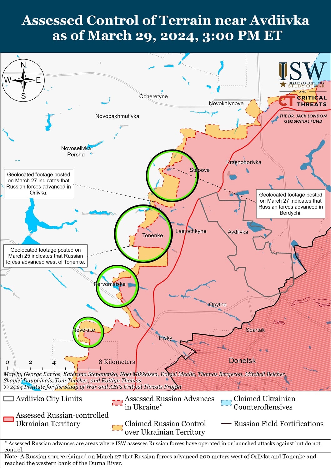 Российские силы продвинулись северо-западнее Авдеевки. Позиционные бои продолжались в районах Семеновки, Бердичей, Тоненького, Уманского, Первомайского и Невельского.