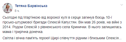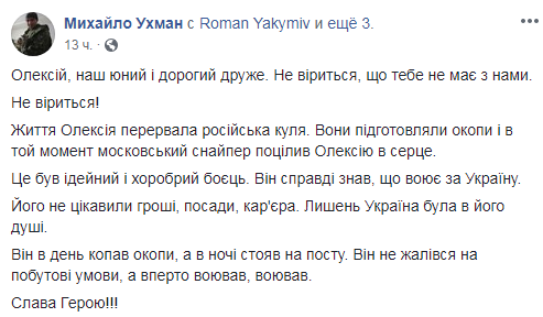 "Жизнь Алексея прервала русский шар. Они (военные 10-й бригады) готовили окопы, и в тот момент московский снайпер попал Алексею в сердце", - рассказал военкор Михаил Ухман.