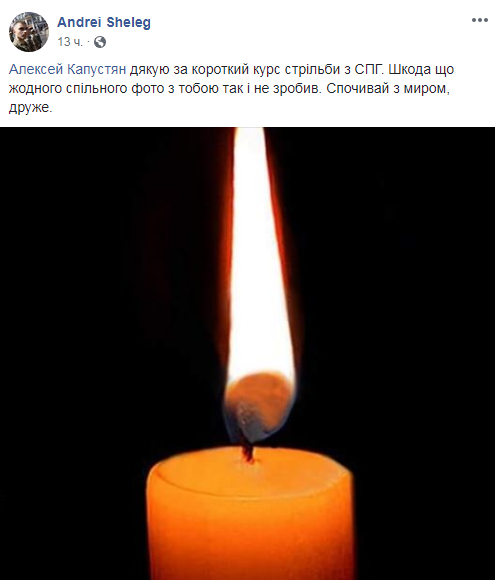 "Алексей, спасибо за краткий курс стрельбы из СПГ. Жаль, что общего фото с тобой так и не сделал. Покойся с миром, друг", - пишет в соцсети собрат погибшего Андрей Шелег.