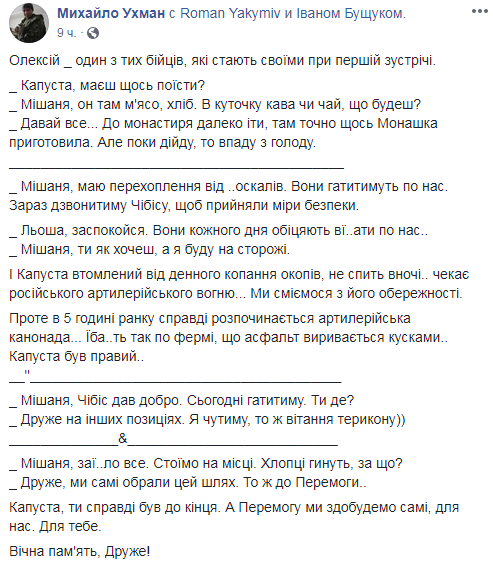 "Это был идейный и храбрый боец. Он действительно знал, что воюет за Украину. Его не интересовали деньги, должности, карьера. Только Украина была в его душе. Он днем копал окопы, а ночью стоял на посту. Он не жаловался на бытовые условия, а упорно воевал, воевал", - отметил собрат.