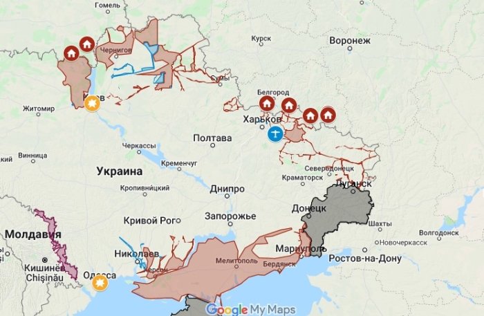 На карте DeepState отмечены, кроме боев и обстрелов, лагеря оккупантов РФ, а также места военных успехов украинских защитников. В частности, показан сбитый российский беспилотник под Харьковом.