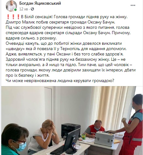 "Во время служебного спора неизвестно по какому вопросу, председатель в сердцах ударил секретаря сельсовета Оксану Бачун. Причем, ударил сильно, наотмашь. Очевидцы говорят, что к избитой женщины пришлось вызвать "скорую", которая и повезла ее в Тернополь для оказания помощи. Вед , оказывается, у Оксаны и без того слабое здоровье", - пишет Богдан Яциковський.