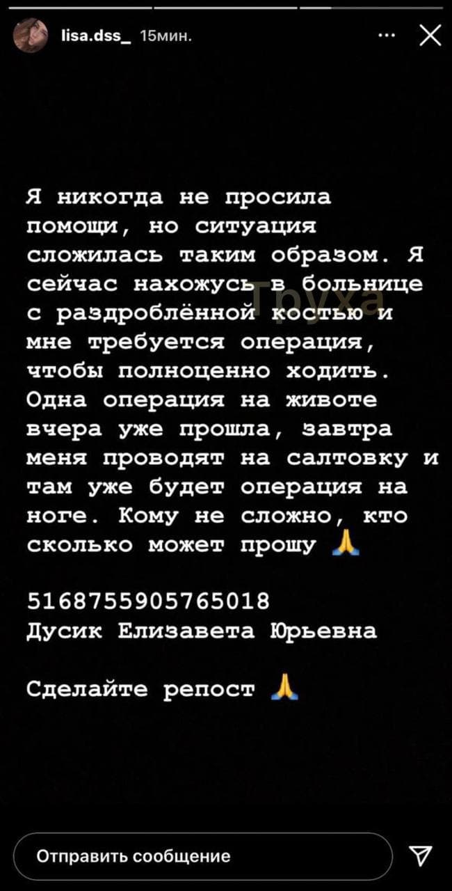 "Я никогда не просила помощи, но ситуация сложилась таким образом. Я сейчас нахожусь в больнице с раздробленной костью, и мне требуется операция, чтобы полноценно ходить. Одна операция на животе вчера уже прошла. Завтра меня проводят на салтовку и там уже будет операция на ноге. Кому не сложно, кто сколько может, прошу.