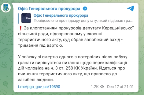 "По ходатайству прокуроров депутату Керецковского сельского совета, подозреваемому в совершении террористического акта, суд избрал меру пресечения - содержание под стражей. В связи со смертью одного из потерпевших после взрыва гранаты решается вопрос о переквалификации действий мужчины по ч. 3 ст. 258 УК Украины. Речь идет о совершении террористического акта, повлекшего гибель человека", - говорится в сообщении.