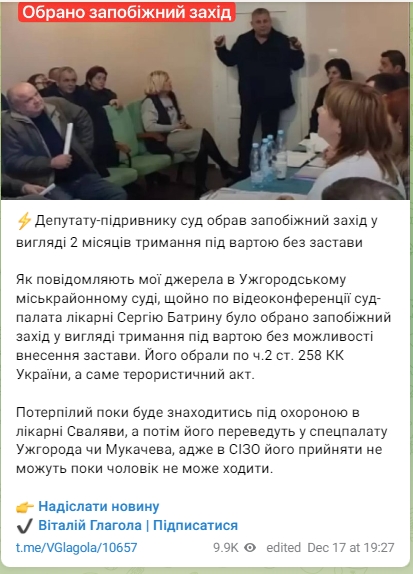 "Как сообщают мои источники в Ужгородском горрайонном суде, только по видеоконференции суд-палата больницы Сергею Батрину была избрана мера пресечения в виде содержания под стражей без возможности внесения залога. Его избрали по ч.2 ст. 258 УК Украины, а именно террористический акт. Пострадавший пока будет находиться под охраной в больнице Свалявы, а затем его переведут в спецпалату Ужгорода или Мукачево, ведь в СИЗО его принять не могут, пока мужчина не может ходить", - написал он.