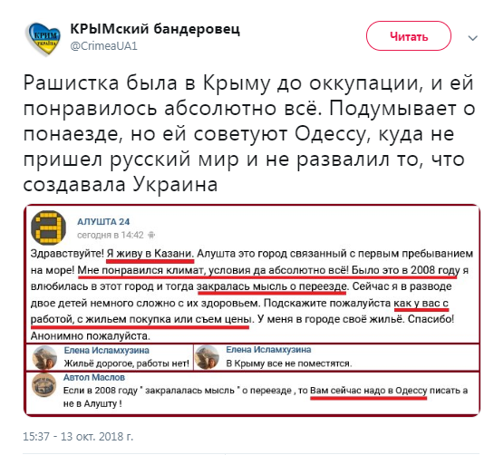 "Рашистка была в Крыму до оккупации, и ей понравилось абсолютно все. Подумывает о понаезде, но ей советуют Одессу, куда не пришел русский мир и не развалил то, что создавала Украина", - пишет блогер.