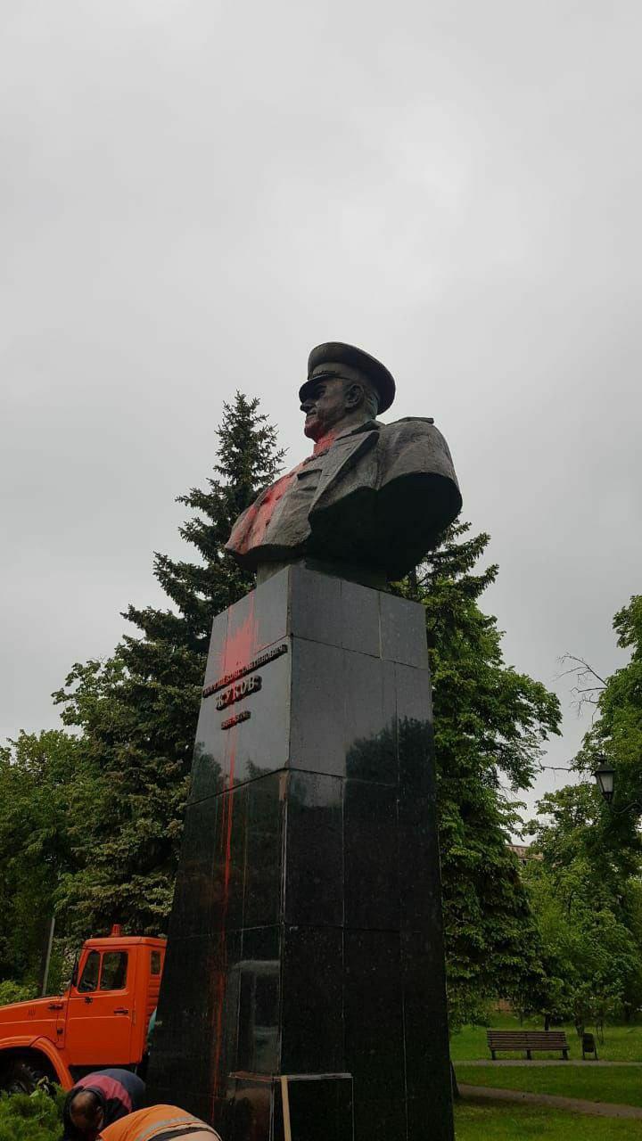 В Харькове облили красной краской памятник маршалу Жукову, который установлен в Немышлянском районе.