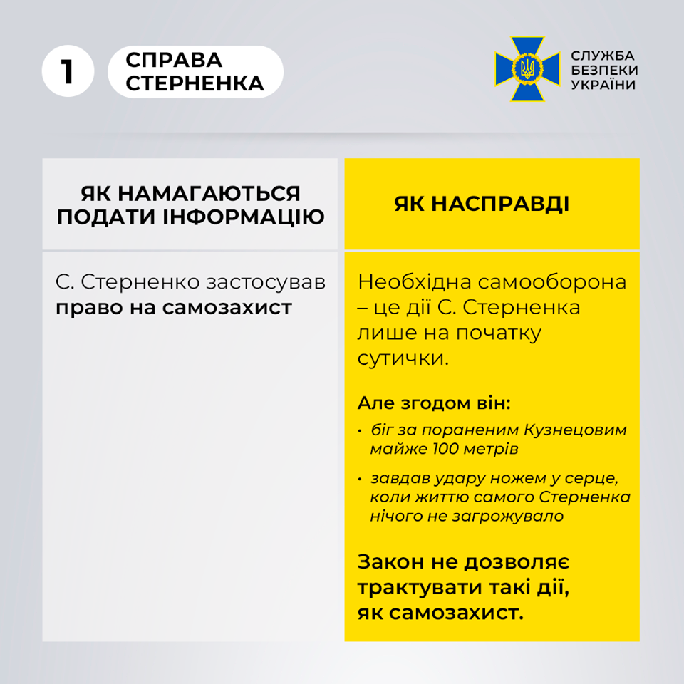 "Отмечаем, что такие действия С. Стерненка могут соответствовать понятию необходимая оборона. Однако его дальнейшие действия ставят под сомнение вышеупомянутую версию. Поскольку Кузнецов скрылся с места происшествия, нападение на Стерненко считается законченным - его жизни и здоровью уже ничего не угрожало. Однако Стерненко побежал за Кузнецовым, догнал его и нанес нескольких ранений, в частности, удар ножом в сердце, который и привел к смерти", - уточнили в СБУ.