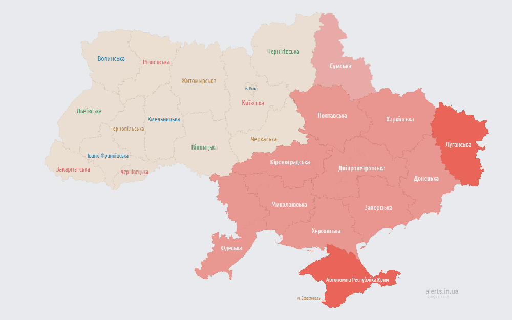 Воздушная тревога объявлена в Луганской, Донецкой, Запорожской, Харьковской, Полтавской, Сумской, Днепропетровской, Кировоградской, Николаевской, Херсонской и Одесской областях, а также в Крыму.