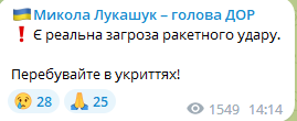 Глава Днепропетровского облсовета Николай Лукашук предупредил о возможности ракетного удара по Днепру и области. Также мониторинговые каналы предупредили о курсе ракет на Запорожье.