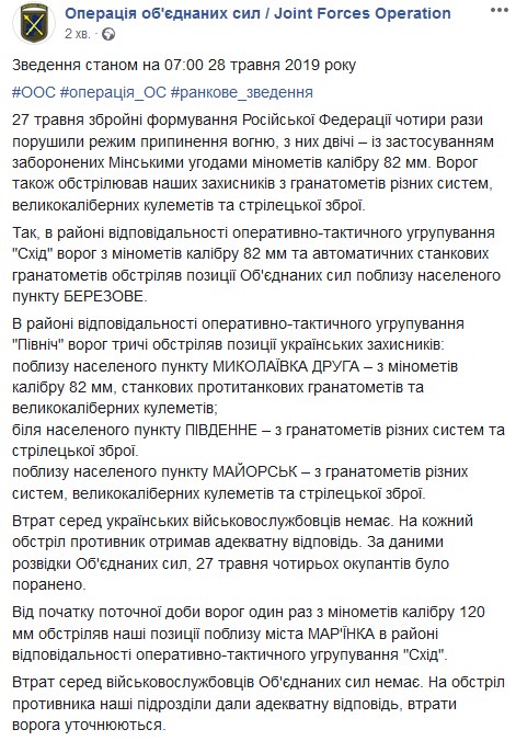В ночь на 28 мая боевики один раз атаковали позиции бойцов ООС, применив минометы калибра 120 мм. Атака была осуществлена вблизи города Марьинка в районе ответственности оперативно-тактической группировки "Восток".