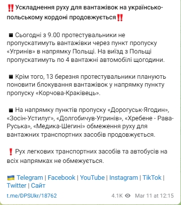 В Польше протестующие, заблокировали гражданские автобусы на ПП "Ягодин-Дорогуск" и не пропускают транспорт в обе стороны.