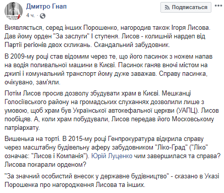 "Юрий Луценко, чем завершилось дело? Лысова наказали орденом?", - пишет Гнап.