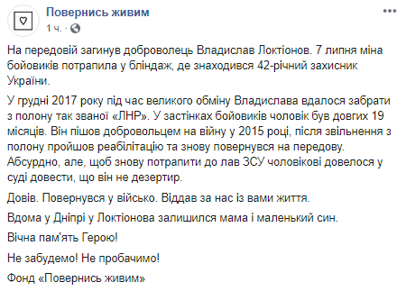"На передовой погиб доброволец Владислав Локтионов. 7 июля мина боевиков попала в блиндаж, где находился 42-летний защитник Украины", - говорится в сообщении.