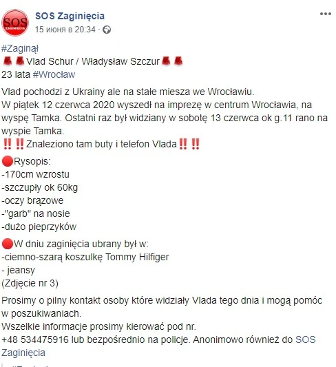 На момент исчезновения был одет в темно-серую футболку и джинсы. Родственники просят всех, кто видел Влада или знает о его местонахождении, позвонить: +48534475916 или непосредственно в полицию.