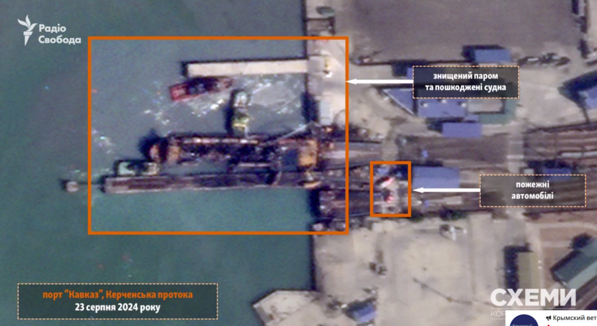На спутниковых снимках от Planet Labs за 23 августа заметно уничтоженный паром и несколько других небольших кораблей, которые были расположены неподалеку. Они также могли получить повреждения в результате атаки по порту "Кавказ".