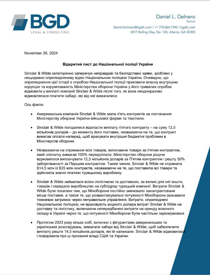 "В течение 2023 года несколько человек, включая фигурантов американских и украинских расследований, требовали взятки от Sinclair & Wilde, чтобы обеспечить выплату оставшихся 14,5 миллионов долларов, которые ей принадлежали. Sinclair & Wilde отказалась и сообщила об этих просьбах властям США и Украины. Пытаясь подчиниться законам как Соединенных Штатов, так и Украины, Sinclair & Wilde уже более года назад привлекла внимание Посольства США в Киеве, правоохранительных органов США и украинских правоохранительных органов к требованию взяток и очевидной коррупции в Министерстве обороны Украины", - сообщается в письме.