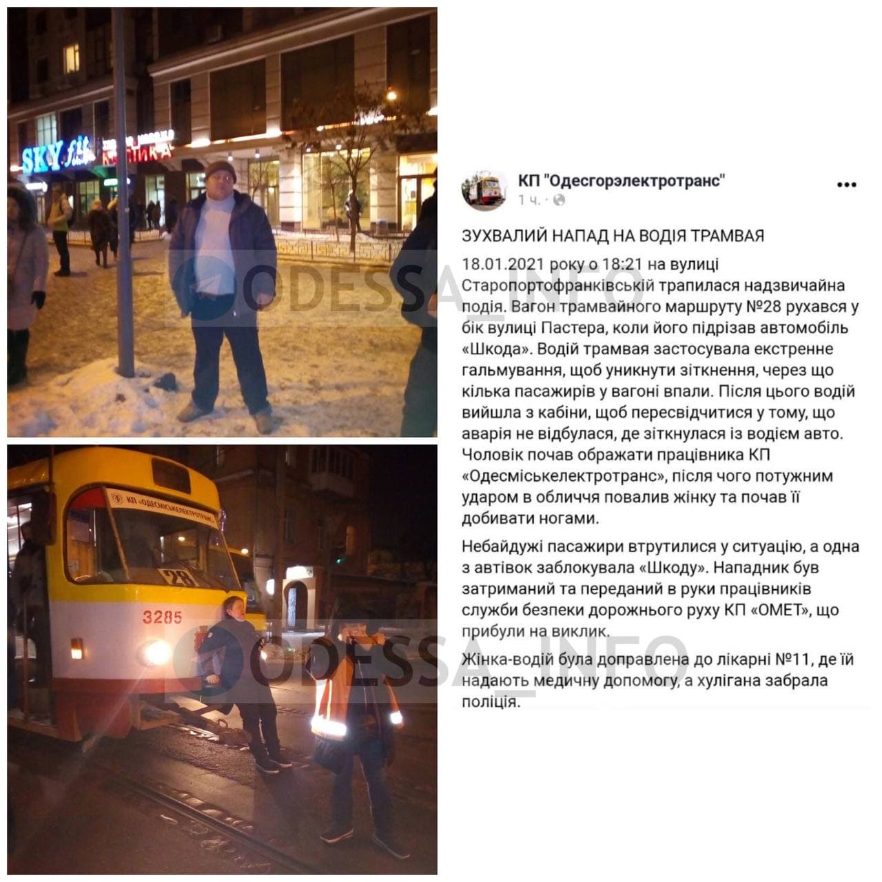 В Одессе в понедельник, 18 января вечером, на улице Старопортофранковской, водитель Skoda подрезал трамвай. Когда женщина-водитель вагона вышла, мужчина из автомобиля напал на нее, ударив в лицо и сбив с ног.
