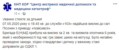 В селе Песочин Харьковской области вечером в четверг, 7 мая, 6-летний мальчик во время игры завис шеей на веревке, родители вызвали "скорую".