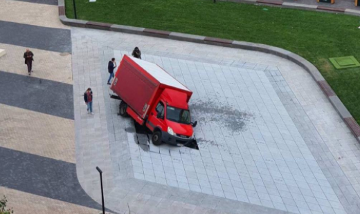 В Польше грузовик провалился в сухой фонтан, как это недавно произошло на Арсенальной площади в Киеве.