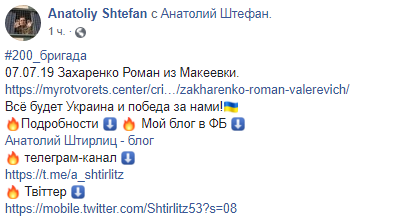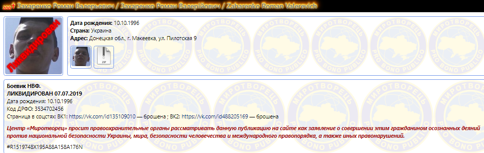 Также сообщается, что 7 июля был ликвидирован 23-летний боевик из Макеевки Роман Захаренко, который к тому же был зачислен в списки "Миротворца".