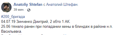 Известно, что 4 июля вследствие тяжелого ранения при попадании мины в боевой блиндаж (25 июня) в районе н.п. Васильевка погиб боевик Дмитрий Зинченко.