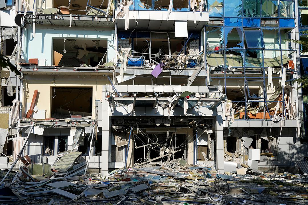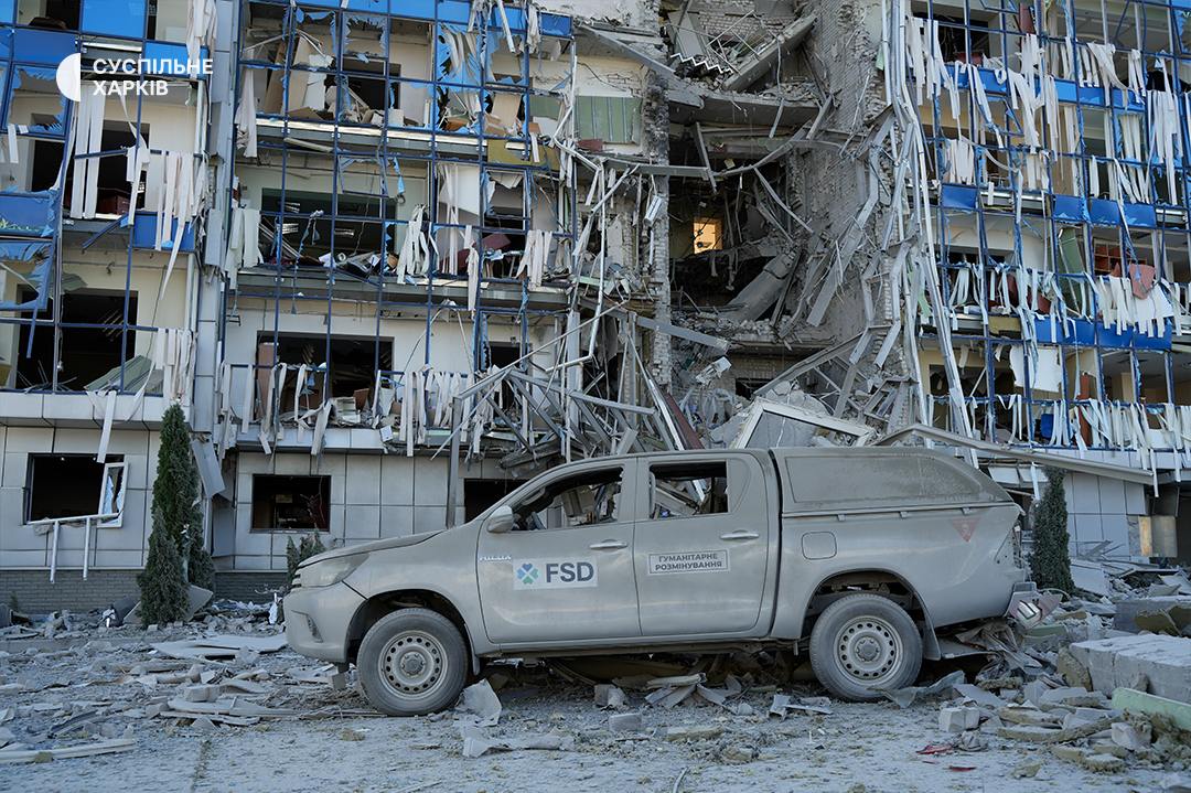 "Суспільне" сообщает, что ракета также попала в офис деминеров швейцарской благотворительной организации FSD, специализирующейся на гуманитарном разминировании. Повреждены по меньшей мере 6 автомобилей, на которых работники выезжали на разминирование полей. Все шесть авто – машины медиков организации. В самом здании обвалилось несколько этажей.
