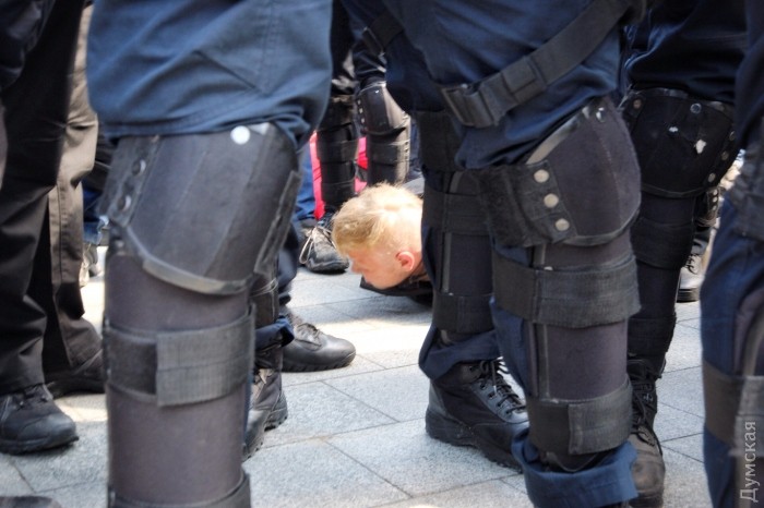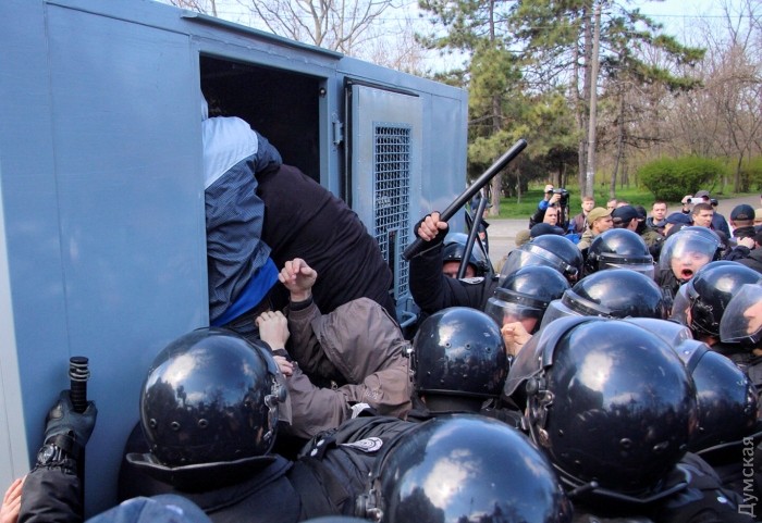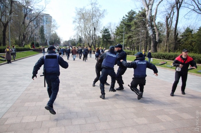 В сети были опубликованы фото потасовки, которая произошла в Одессе на Аллее Славы у памятника Неизвестному матросу во время проведения митинга по случаю 73-й годовщины освобождения от нацистской Германии.