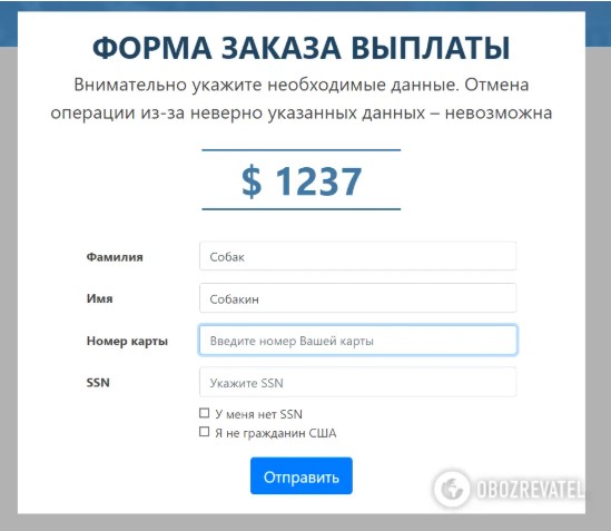 Когда человек заходит на сам сайт организации, его личные данные якобы начинает проверят живой человек, после чего ему предложат забрать деньги. Для этого нужно указать номер банковской карты и SSN (Social Security number) – американский номер социального страхования, который может быть только у граждан США. После этого сайт услужливо предложил получить временный SSN за 15,45 доллара (примерно 410 гривен).