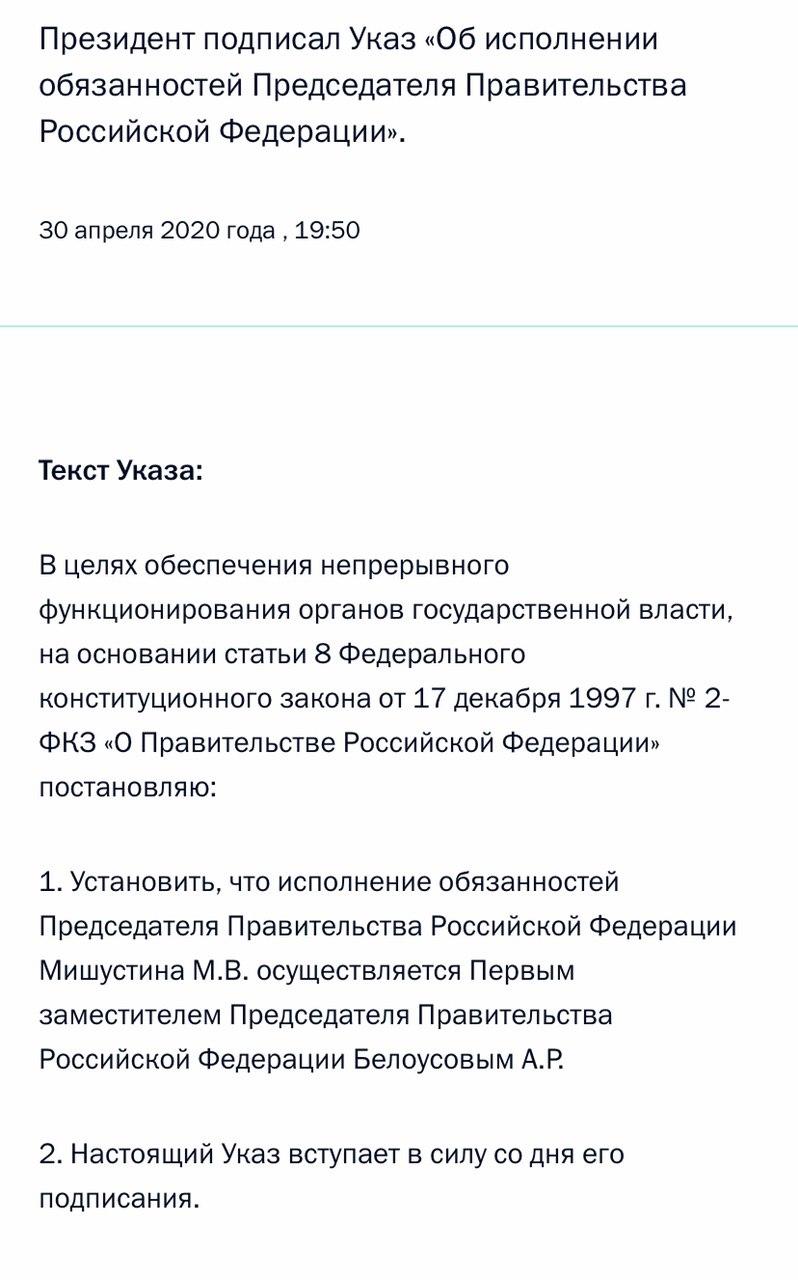 После этого Путин подписал указ о назначении первого вице-премьера Белоусова и.о. главы правительства РФ.