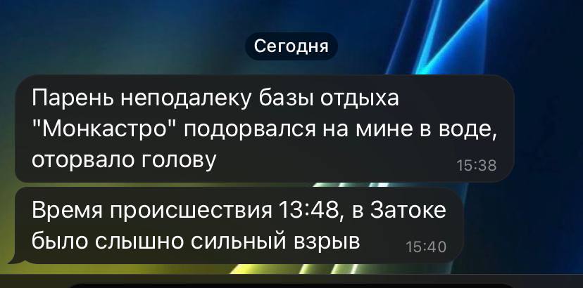 В Затоке Белгород-Днестровского района Одесской области в прибрежных водах Черного моря взорвалась мина: 30-летнему мужчине оторвало голову.