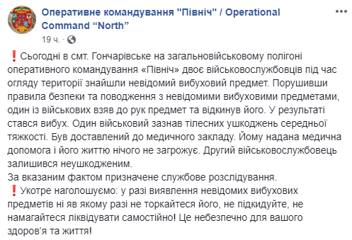 27 марта в пгт. Гончаровское на общевойсковом полигоне оперативного командования "Пивнич" один из военнослужащих, пытался самостоятельно обезвредить найденный взрывной предмет, в результате чего один боец ВСУ получил ранения.