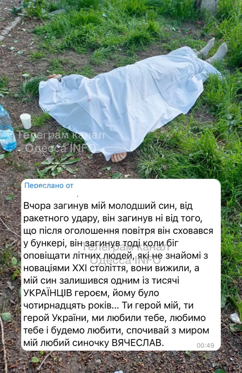 Вследствие вражеских ракетных обстрелов Одессы 2 мая, в понедельник, погиб 14-летний подросток, который бежал оповестить пожилых людей о необходимости спуститься в укрытие. Также из-за авиаудара по пострадала 17-летняя девушка, а еще повреждено религиозное сооружение.