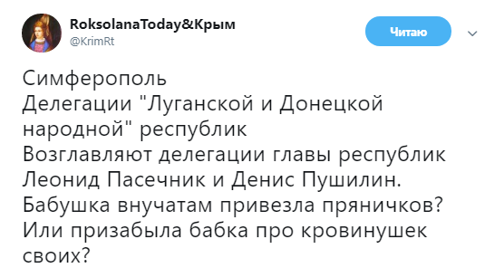 "Симферополь. Делегации "Луганской и Донецкой народной" республик. Возглавляют делегации главы республик Леонид Пасечник и Денис Пушилин. Бабушка внучатам привезла пряничков? Или призабыла бабка про кровинушек своих?", - говорится в сообщении.