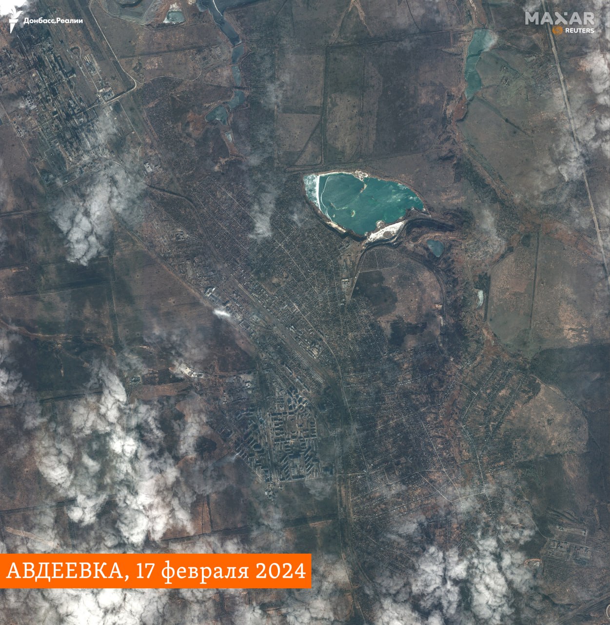"Авдеевка со спутника до полномасштабного вторжения России в Украину и 17 февраля – в день, когда украинские войска вышли из города после 4 месяцев масштабного российского наступления на него".