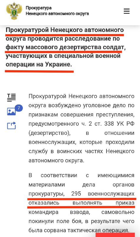 "295 военнослужащих отказались выполнять приказ командира, самовольно покинули поле боя, в результате чего была сорвана тактическая операция. Возбуждено уголовное дело по признакам совершения преступления, предусмотренного ч.2 ст. 338 Уголовного кодекса РФ", - подчеркнули в прокуратуре Ненецкого автономного округа.