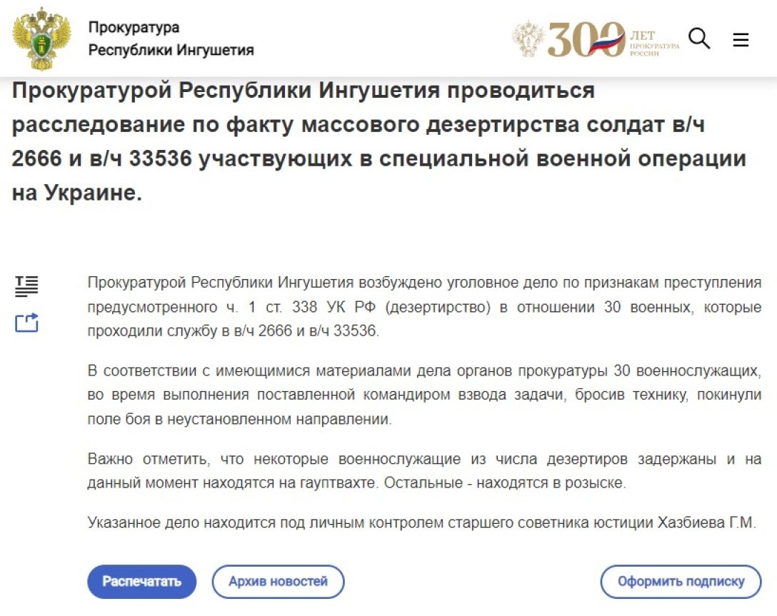 Стоит отметить, что на сайте прокуратуры Республики Ингушетия опубликован похожий пресс-релиз, в котором сказано о начале расследования факта дезертирства еще 30 солдат. Указанные военнослужащие, по данным ведомства, также принимают участие в полномасштабной войне против Украины.