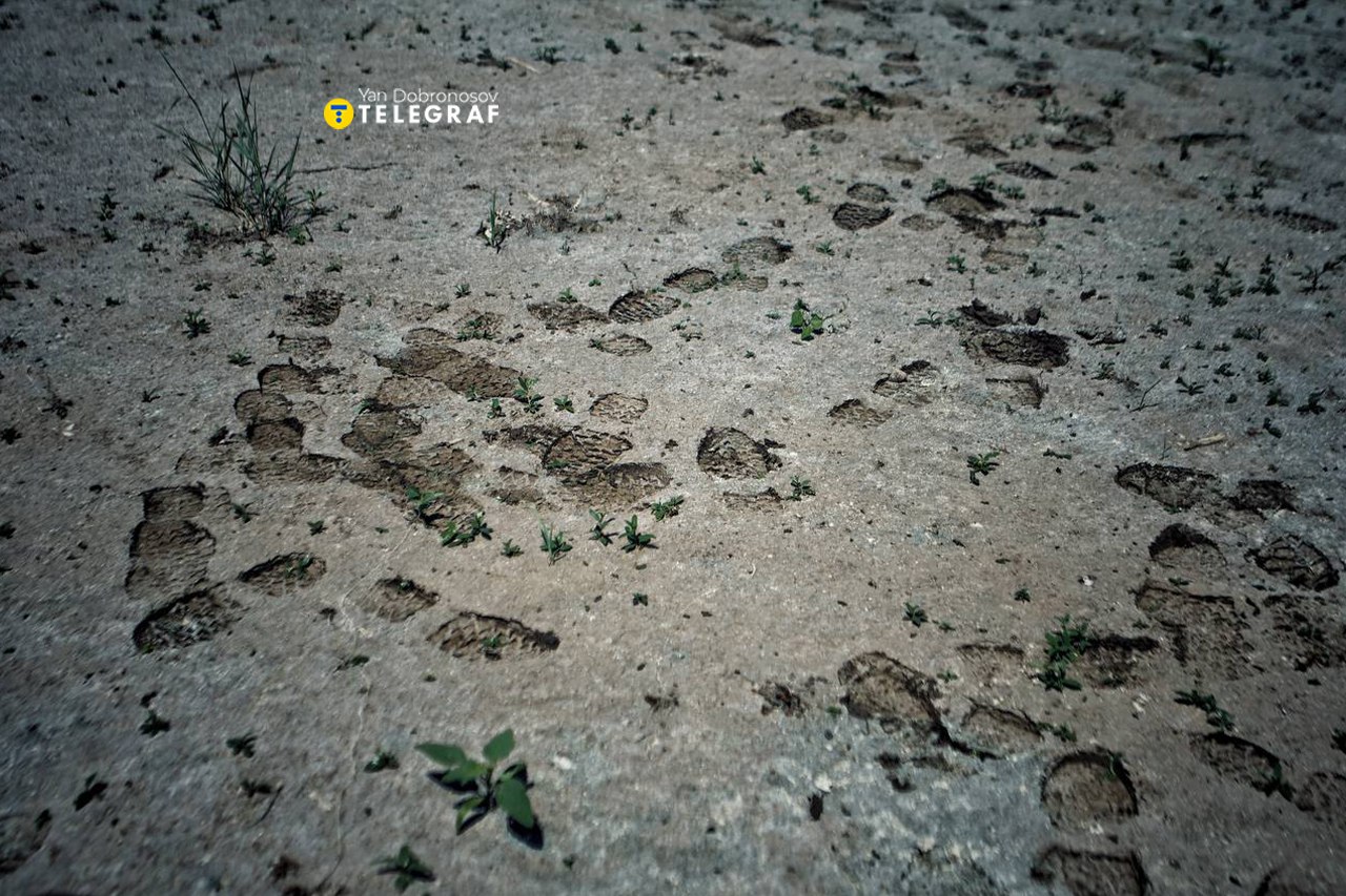 На опубликованных фотографиях можно увидеть "пустыню", траву, которая начинает расти на этой местности, следы человеческих ног и местами со стоячей водой, издалека напоминающие лужи.