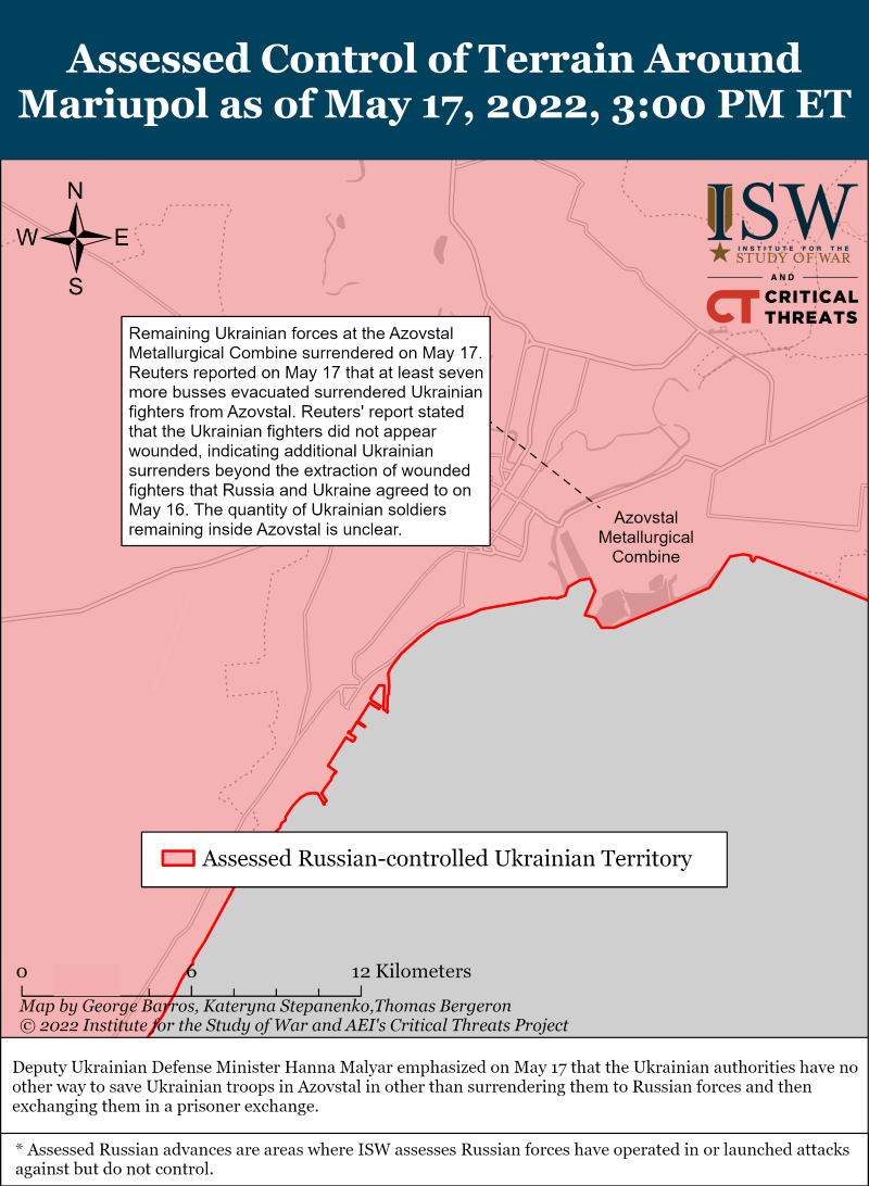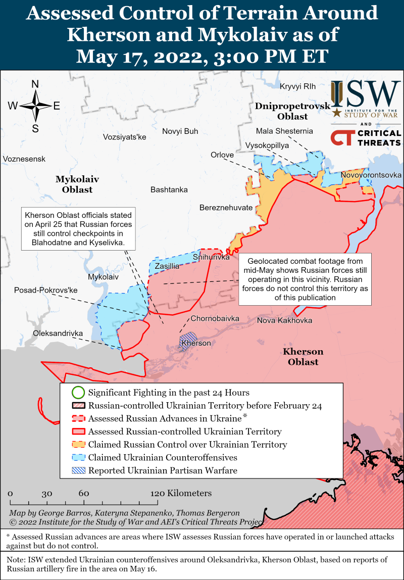 Российские войска безуспешно пытались улучшить свои тактические позиции южнее Изюма для возобновления наступательных действий. Украинский генеральный штаб сообщил, что российские войска пополняют войска и накапливают резервы для возобновления наступления на Славянск. Россияне не захватили шоссе к востоку от Довгеньке – села примерно в 30 км к югу от Изюма; эта дорога необходима для продолжения наступления на Славянск. 17 мая украинская артиллерия уничтожила российскую технику всего в 15 км к северу от Изюма.