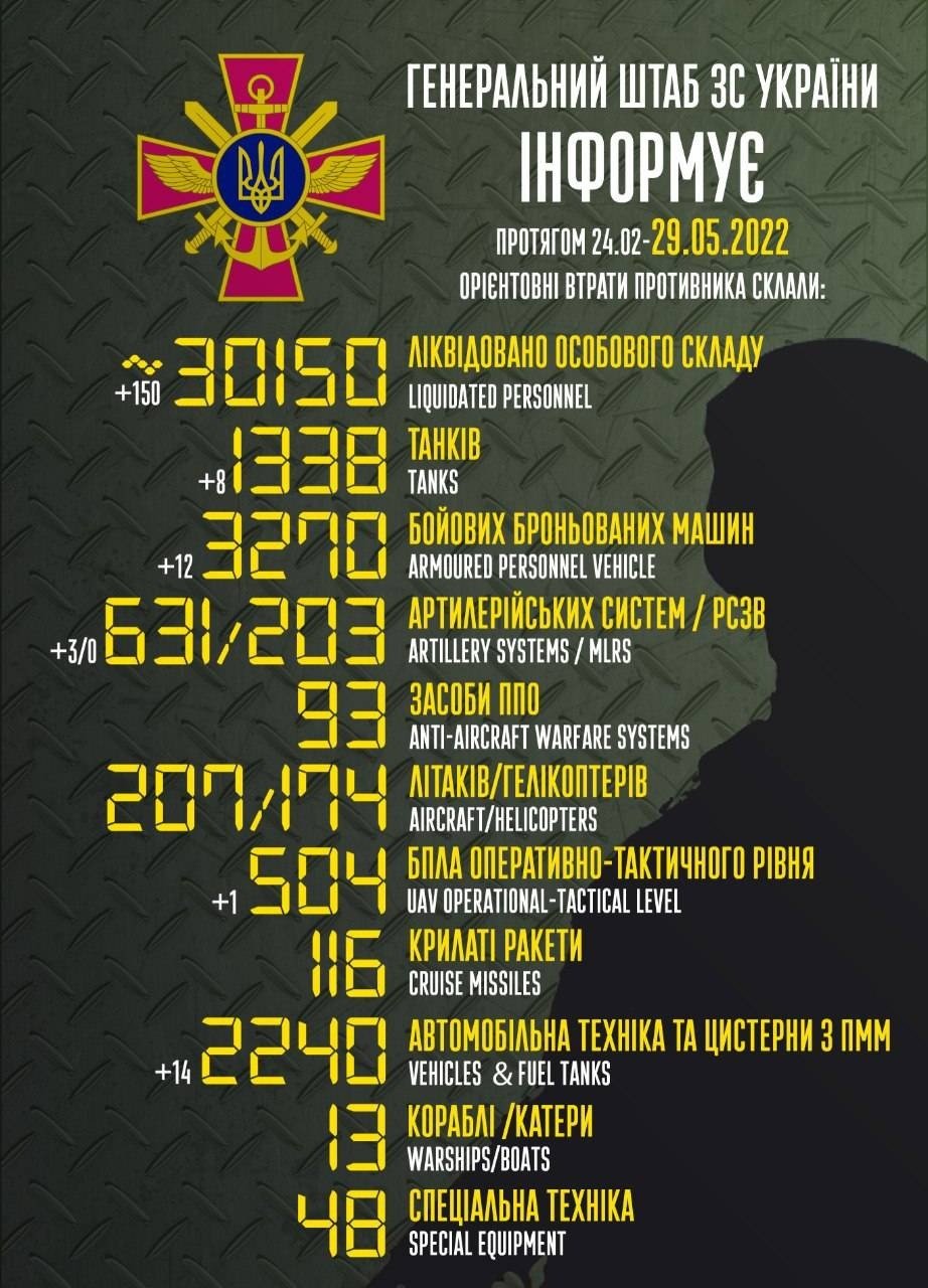 Общие боевые потери противника с 24.02 по 29.05 ориентировочно составили: