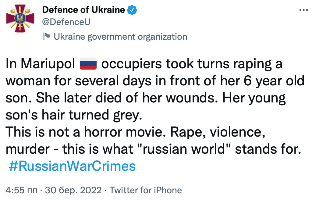 "В Мариуполе оккупанты несколько дней поочередно изнасиловали женщину на глазах у ее 6-летнего сына. Позже она умерла от ран. Волосы ее маленького сына поседели. Это не фильм ужасов. Изнасилование, насилие, убийства – вот что значит "русский мир", – написали в ведомстве.