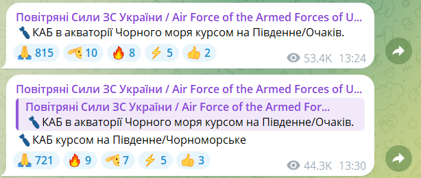 Сообщение о КАБ в Одесской области опубликовали в Воздушных силах ВС Украины в 13:24.