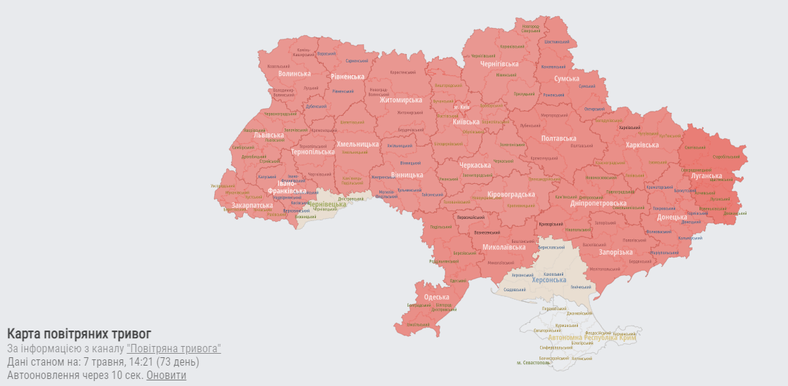 Отметим, по состоянию на 14:20 7 мая воздушная тревога объявлена практически по всей территории Украины. Одесситы сообщают, что слышат взрывы, работает ПВО и истребительная авиация. Жителей просят оставаться в укрытиях.