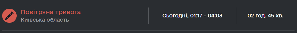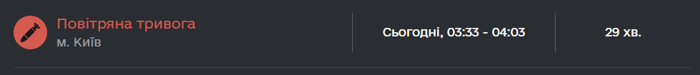 Воздушная тревога в Киеве была объявлена сегодня ночью в 03:33 – она продолжалась до 04:03. В области тревога была несколько дольше – с 01:17 до 04:03. Воздушные Силы ВС Украины писали о движении "шахедов", которые держали курс на Киевщину из Черкасской области.