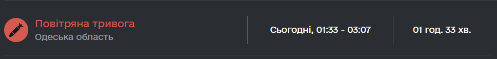 В Одессе воздушная тревога ночью продолжалась с 01:33 до 03:07. Воздушные Силы ВС Украины в 01:31 предупреждали о новой группе "шахедов" с временно оккупированной территории Херсонской области: "Курс в направлении Одессы".