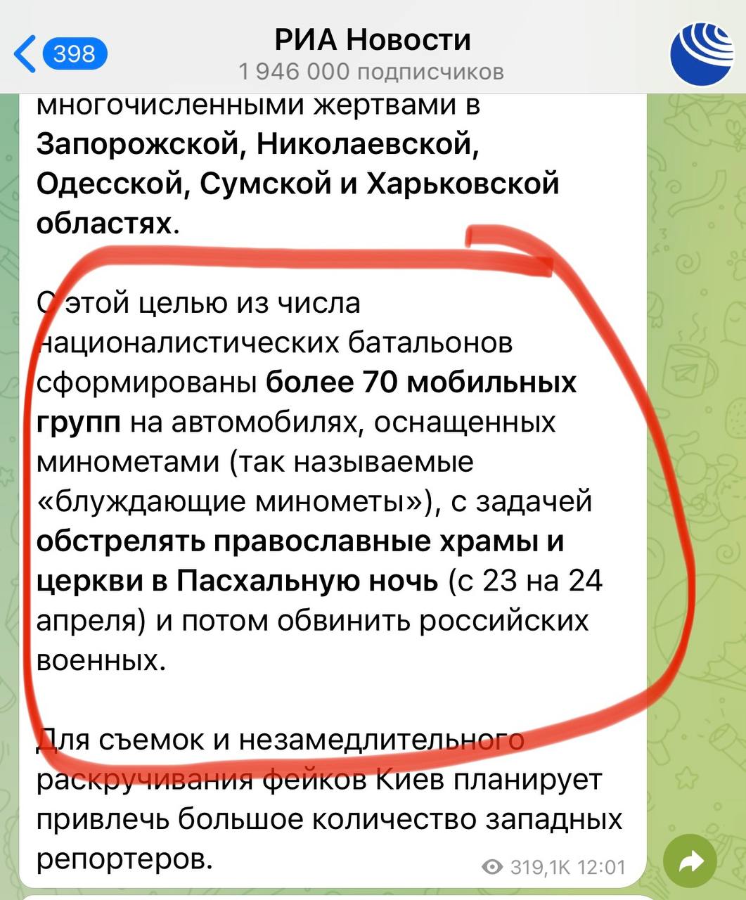 По информации Минобороны РФ, Украина якобы сформировала "более 70 мобильных групп на автомобилях оснащенных минометами (так называемые "блуждающие минометы"), с задачей обстрелять православные храмы и церкви в Пасхальную ночь (с 23 на 24 апреля) и затем обвинить российских военных".